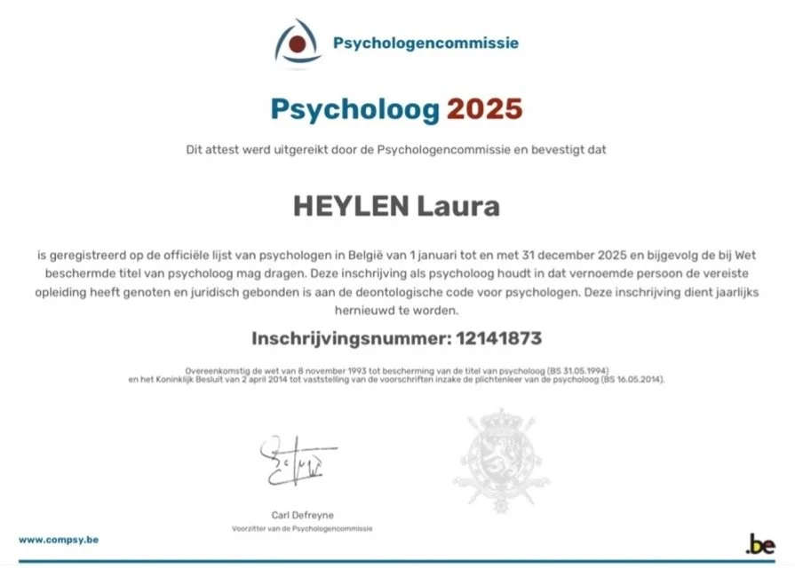 De Psychologencommissie is de officiële regulerende instantie voor psychologen in België, en lidmaatschap ervan bevestigt mijn registratie, erkenning en naleving van ethische richtlijnen. Het lidmaatschap zorgt er ook voor dat ik mijn professionele kennis voortdurend bijwerk en de kwaliteit van mijn psychologische dienstverlening waarborg.